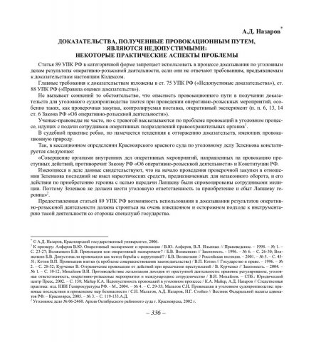 Библиографическое описание:Назаров, Александр Дмитриевич. Доказательства, полученные провокационным путем, являются недопустимыми: некоторые практические аспекты проблемы / А. Д. Назаров. - Текст : непосредственный // Вестник Красноярского государственного университета. - 2006. - Гуманитарные науки, № 6. - С. 336-340. - Библиогр. в конце ст.