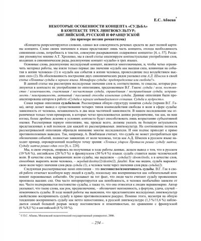 Библиографическое описание:Абаева, Е. С. Некоторые особенности концепта "судьба" в контексте трех лингвокультур: английской, русской и французской (на примере поэзии романтизма) / Е. С. Абаева. - Текст : непосредственный // Вестник Красноярского государственного университета. - 2006. - Гуманитарные науки, № 6. - С. 254-257. - Библиогр. в конце ст.