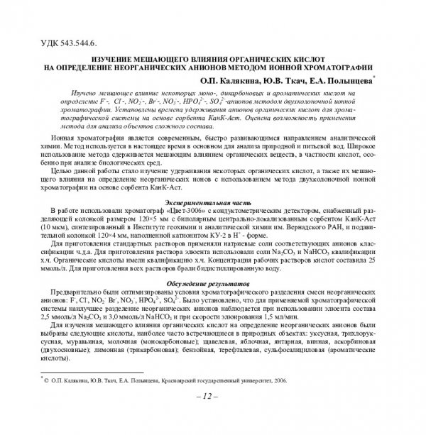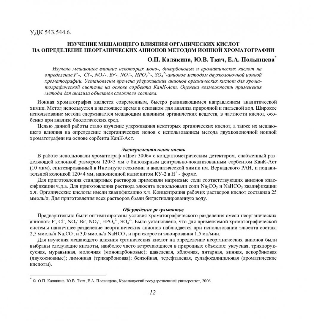 Библиографическое описание:Калякина, Ольга Петровна. Изучение мешающего влияния органических кислот на определение неорганических анионов методом ионной хроматографии / О. П. Калякина, Ю. В. Ткач, Е. А. Полынцева. - Текст : непосредственный // Вестник Красноярского государственного университета. - 2006. - Естественные науки, № 2. - С. 12-16. - Библиогр. в конце ст.