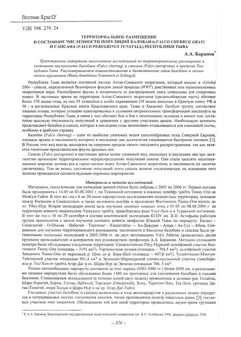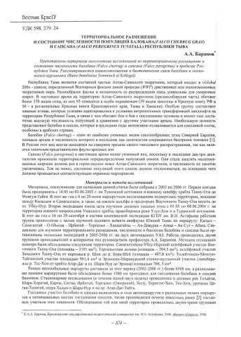 Библиографическое описание:Баранов, Александр Алексеевич. Территориальное размещение и состояние численности популяций балобана (Falco cherrug gray) и сапсана (Falco peregrinus tunstall) Республики Тыва / А. А. Баранов. - Текст : непосредственный // Вестник Красноярского государственного университета. - 2006. - Естественные науки, № 5(1). - С. 104-110. - Библиогр. в конце ст.