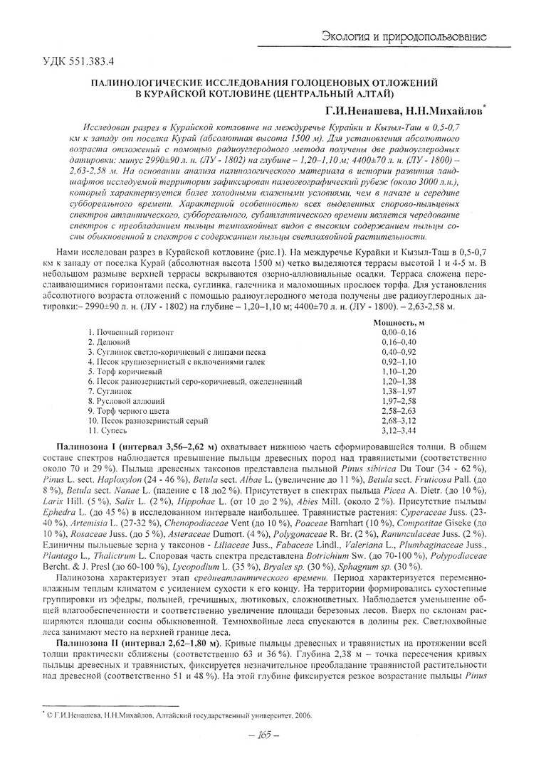 Библиографическое описание:Ненашева, Г. И. Палинологические исследования голоценовых отложений в Курайской котловине (Центральный Алтай) / Г. И. Ненашева, Н. Н. Михайлов. - Текст : непосредственный // Вестник Красноярского государственного университета. - 2006. - Естественные науки, № 5(1). - С. 165-169.