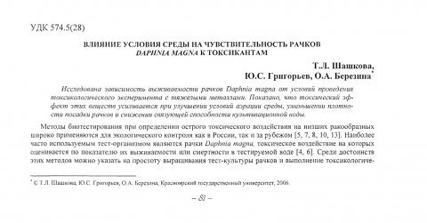 Библиографическое описание:Шашкова, Татьяна Леонидовна. Влияние условий среды на чувствительных рачков Daphnia magna к токсикантам / Т. Л. Шашкова, Ю. С. Григорьев, О. А. Березина. - Текст : непосредственный // Вестник Красноярского государственного университета. - 2006. - Естественные науки, № 5(1). - С. 81-85. - Библиогр. в конце ст.