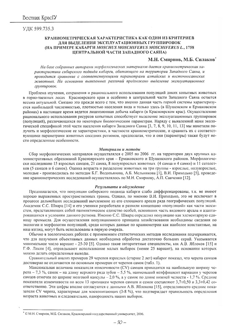 Библиографическое описание:Смирнов, Марк Николаевич. Краниометрическая характеристика как один из критериев для выделения эксплуатационных группировок (на примере кабарги Moschus Moschus Moschiferus L., 1758 центральной части Западного Саяна) / М. Н. Смирнов, М. Б. Силаков. - Текст : непосредственный // Вестник Красноярского государственного университета. - 2006. - Естественные науки, № 5(1). - С. 50-54. - Библиогр. в конце ст.