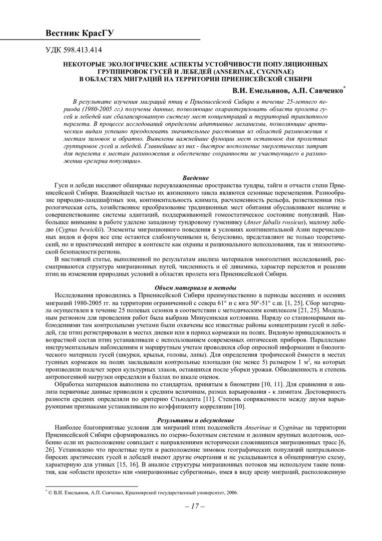 Библиографическое описание:Емельянов, Владимир Иванович. Некоторые экологические аспекты устойчивости популяционных группировок гусей и лебедей (Anserinae, Cygninae) в областях миграций на территории Приенисейской Сибири / В. И. Емельянов, А. П. Савченко. - Текст : непосредственный // Вестник Красноярского государственного университета. - 2006. - Естественные науки, № 5. - С. 17-26. - Библиогр. в конце ст.