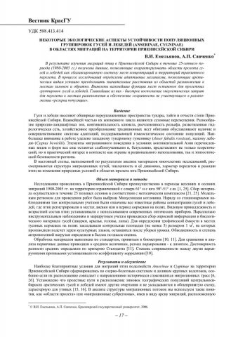 Некоторые экологические аспекты устойчивости популяционных группировок гусей и лебедей (Anserinae, Cygninae) в областях миграций на территории Приенисейской Сибири