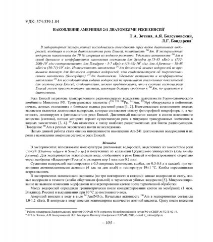Библиографическое описание:Зотина, Татьяна Анатольевна. Накопление америция-241 диатомеями реки Енисей / Т. А. Зотина, А. Я. Болсуновский, Л. Г. Бондарева. - Текст : непосредственный // Вестник Красноярского государственного университета. - 2006. - Естественные науки, № 5. - С. 103-106. - Библиогр. в конце ст.