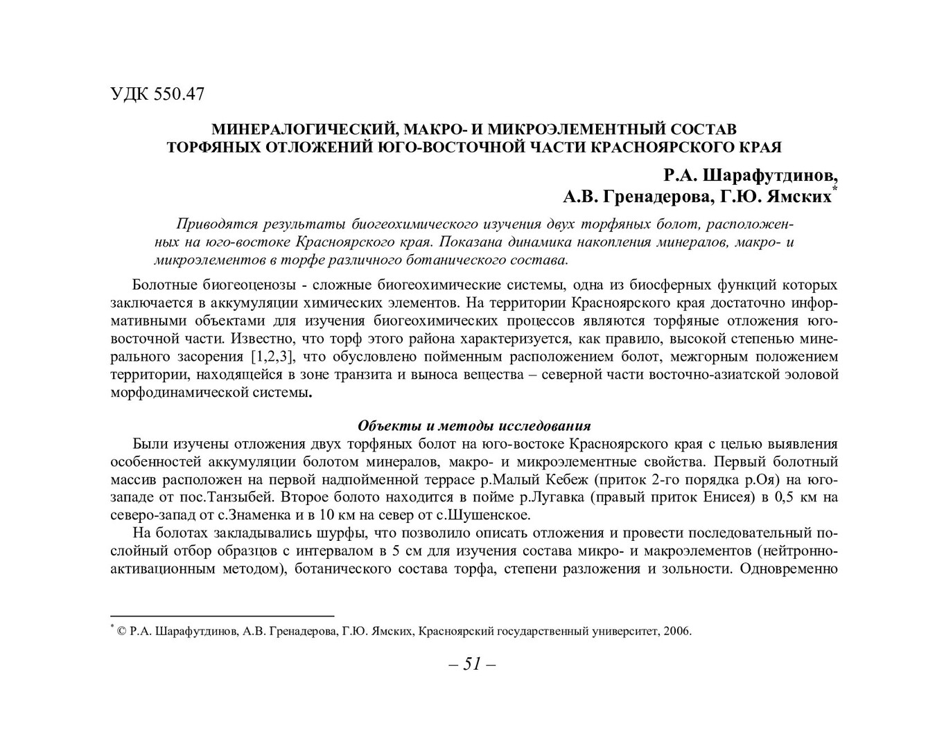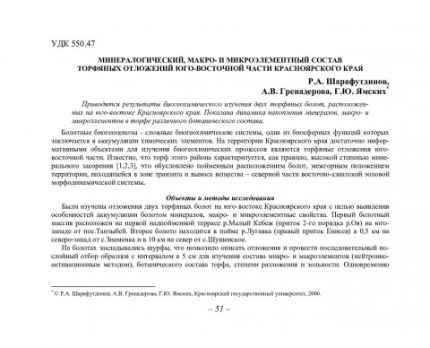 Библиографическое описание:Шарафутдинов, Руслан Аглямович. Минералогический, макро- и микроэлементный состав торфяных отложений юго-восточной части Красноярского края / Р. А. Шарафутдинов, А. В. Гренадерова, Г. Ю. Ямских. - Текст : непосредственный // Вестник Красноярского государственного университета. - 2006. - Естественные науки, № 5. - С. 51-57. - Библиогр. в конце ст.