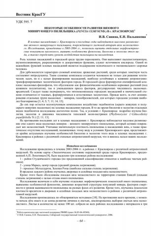 Библиографическое описание:Санина, И. В. Некоторые особенности развития вязового минирующего пилильщика (Fenusa ulmi sund.) в г. Красноярске / И. В. Санина, Е. Н. Пальникова. - Текст : непосредственный // Вестник Красноярского государственного университета. - 2006. - Естественные науки, № 5. - С. 64-68. - Библиогр. в конце ст.
