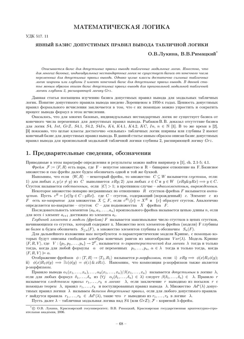 Библиографическое описание:Лукина, О. В. Явный базис допустимых правил вывода табличной логики / О. В. Лукина, В. В. Римацкий. - Текст : непосредственный // Вестник Красноярского государственного университета. - 2006. - Физико-математические науки, № 1. - С. 68-71. - Библиогр. в конце ст.