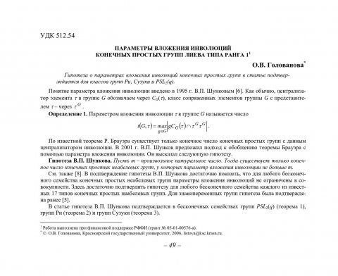 Библиографическое описание:Голованова, Ольга Владимировна. Параметры вложения инволюций конечных простых групп лиева типа ранга 1 / О. В. Голованова. - Текст : непосредственный // Вестник Красноярского государственного университета. - 2006. - Физико-математические науки, № 4. - С. 49-54. - Библиогр. в конце ст.