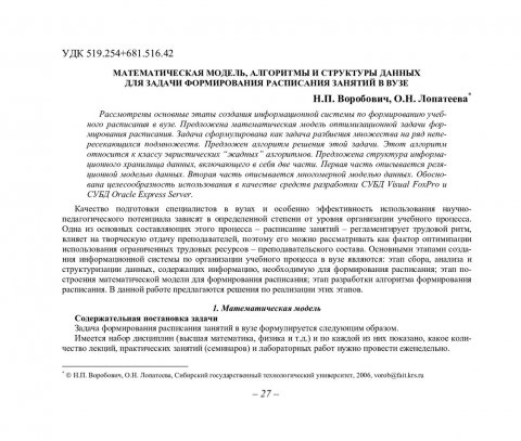 Библиографическое описание:Воробович, Н. П. Математическая модель, алгоритмы и структуры данных для задачи формирования расписания занятий в вузе / Н. П. Воробович, О. Н. Лопатеева. - Текст : непосредственный // Вестник Красноярского государственного университета. - 2006. - Физико-математические науки, № 4. - С. 27-35. - Библиогр. в конце ст.