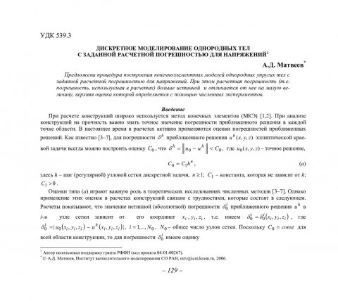 Библиографическое описание:Матвеев, Александр Данилович. Дискретное моделирование однородных тел с заданной расчетной погрешностью для напряжений / А. Д. Матвеев. - Текст : непосредственный // Вестник Красноярского государственного университета. - 2006. - Физико-математические науки, № 7. - С. 129-134. - Библиогр. в конце ст.