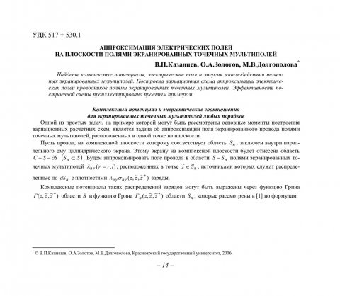 Библиографическое описание:Казанцев, Владимир Петрович. Аппроксимация электрических полей на плоскости полями экранированных точечных мультиполей / В. П. Казанцев, О. А. Золотов, М. В. Долгополова. - Текст : непосредственный // Вестник Красноярского государственного университета. - 2006. - Физико-математические науки, № 7. - С. 14-18. - Библиогр. в конце ст.