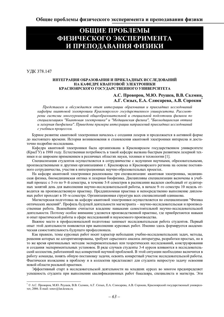 Библиографическое описание:Интеграция образования и прикладных исследований на кафедре квантовой электроники Красноярского государственного университета / А. С. Проворов, М. Ю. Реушев, В. В. Салмин [и др.]. - Текст : непосредственный // Вестник Красноярского государственного университета. - 2006. - Физико-математические науки, № 7. - С. 63-67. - Библиогр. в конце ст.