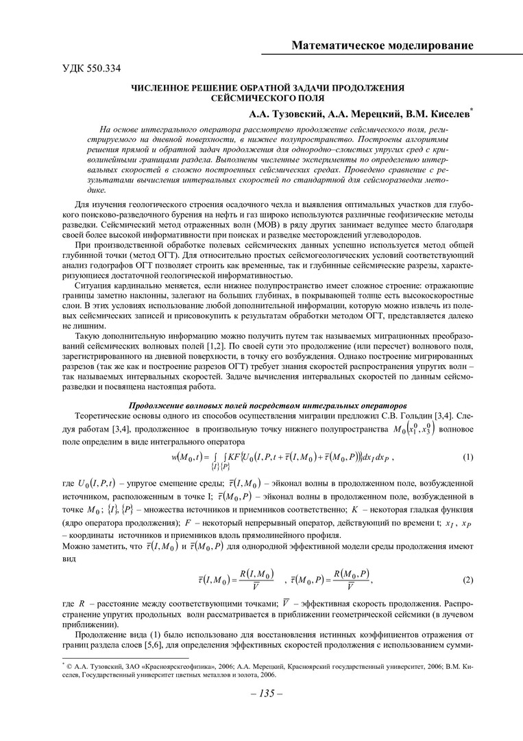 Библиографическое описание:Тузовский, Александр Алексеевич. Численное решение обратной задачи продолжения сейсмического поля / А. А. Тузовский, А. А. Мерецкий, В. М. Киселев. - Текст : непосредственный // Вестник Красноярского государственного университета. - 2006. - Физико-математические науки, № 7. - С. 135-142. - Библиогр. в конце ст.