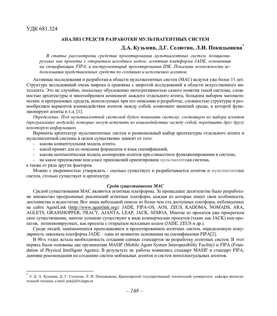 Библиографическое описание:Кузьмин, Дмитрий Александрович. Анализ средств разработки мультиагентных систем / Д. А. Кузьмин, Д. Г. Селютин, Л. И. Покидышева. - Текст : непосредственный // Вестник Красноярского государственного университета. - 2006. - Физико-математические науки, № 7. - С. 168-172. - Библиогр. в конце ст.
