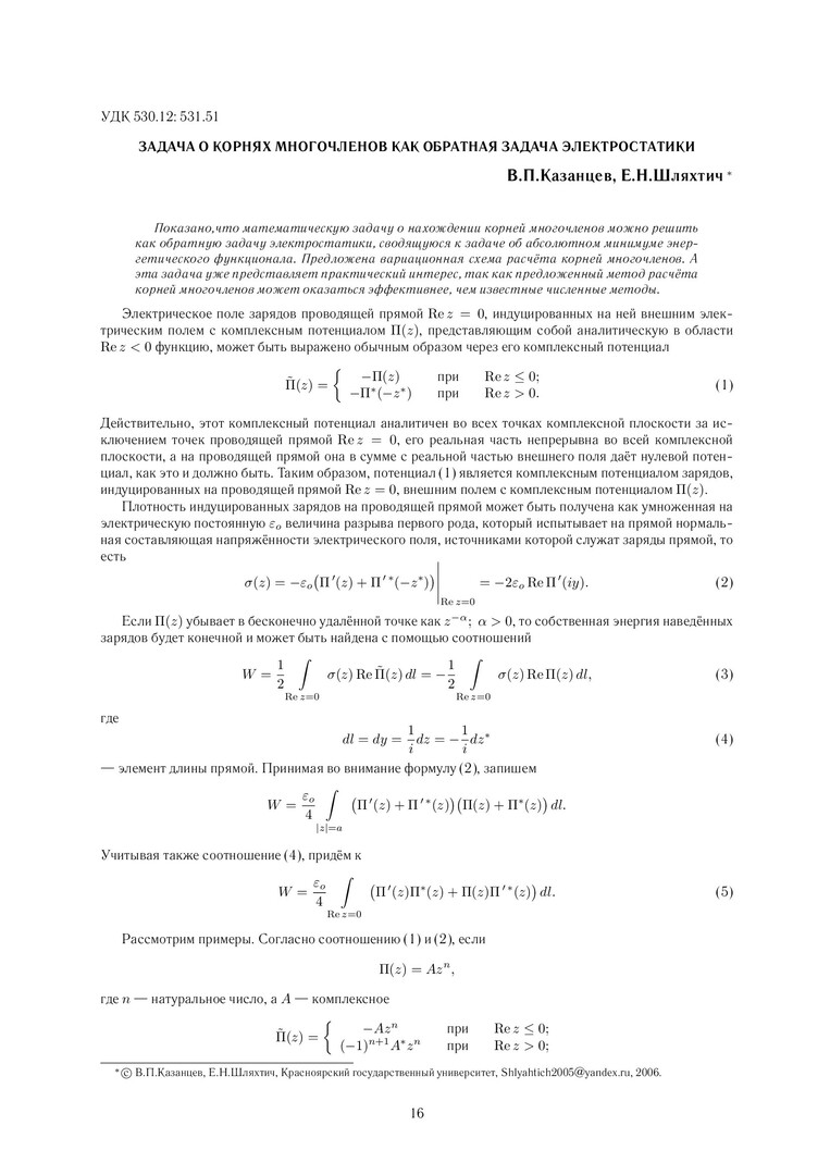 Библиографическое описание:Казанцев, Владимир Петрович. Задача о корнях многочленов как обратная задача электростатики / В. П. Казанцев, Е. Н. Шляхтич. - Текст : непосредственный // Вестник Красноярского государственного университета. - 2006. - Физико-математические науки, № 9. - С. 16-20. - Библиогр. в конце ст.