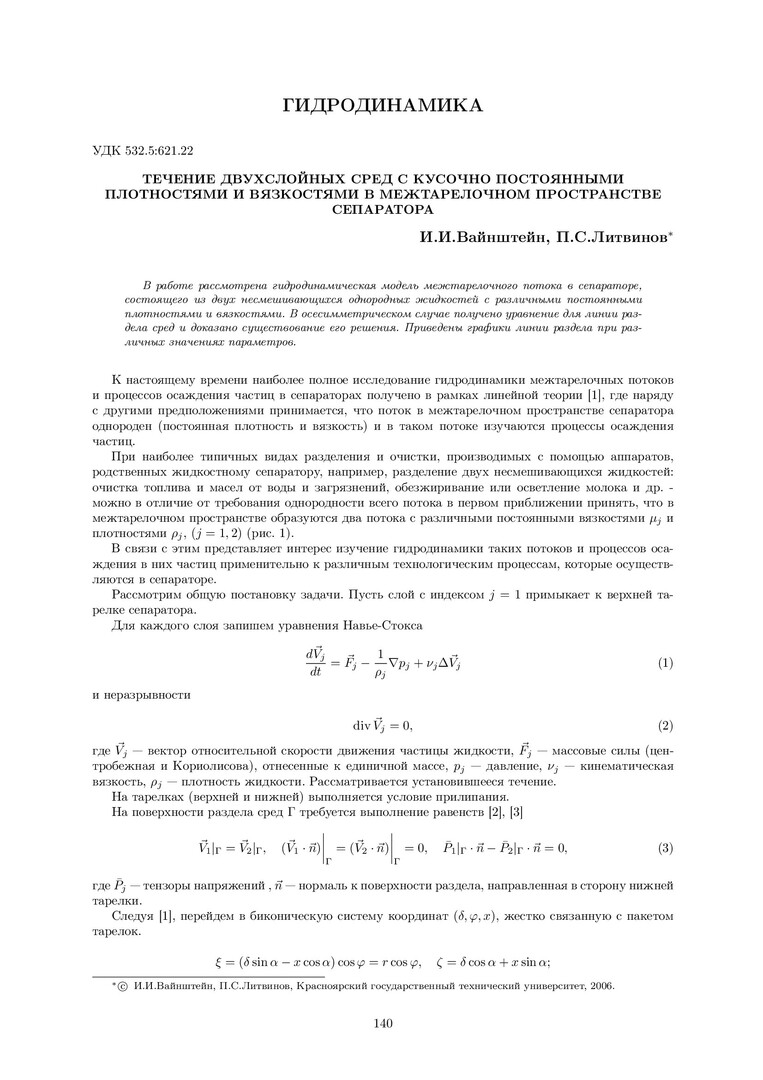Библиографическое описание:Вайнштейн, Исаак Иосифович. Течение двухслойных сред с кусочно постоянными плотностями и вязкостями в межтарелочном пространстве сепаратора / И. И. Вайнштейн, П. С. Литвинов. - Текст : непосредственный // Вестник Красноярского государственного университета. - 2006. - Физико-математические науки, № 9. - С. 140-147. - Библиогр. в конце ст.
