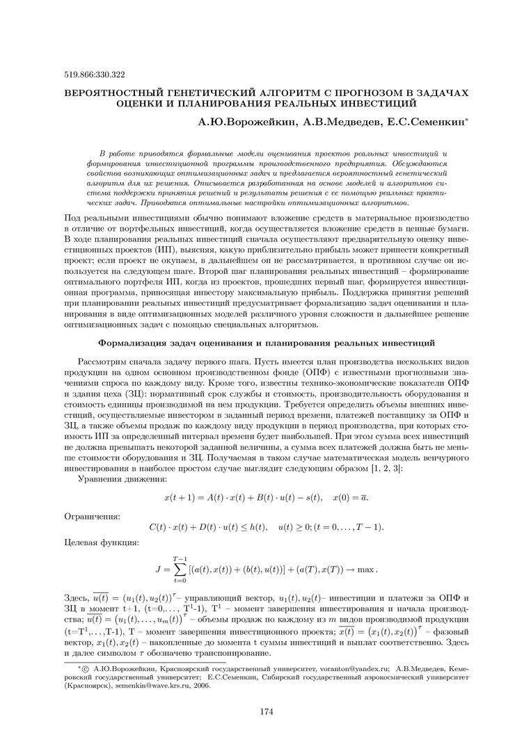 Библиографическое описание:Ворожейкин, Антон Юрьевич. Вероятностный генетический алгоритм с прогнозом в задачах оценки и планирования реальных инвестиций / А. Ю. Ворожейкин, А. В. Медведев, Е. С. Семенкин. - Текст : непосредственный // Вестник Красноярского государственного университета. - 2006. - Физико-математические науки, № 9. - С. 174-178. - Библиогр. в конце ст.