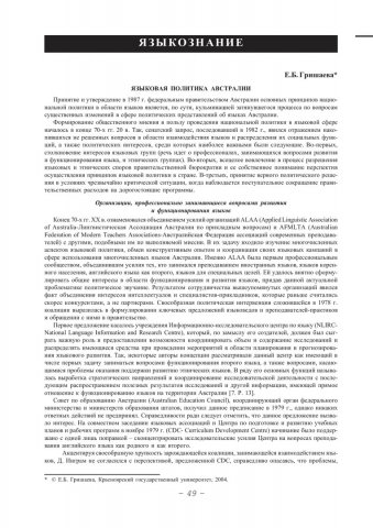 Библиографическое описание:Гришаева, Елена Борисовна. Языковая политика Австралии / Е. Б. Гришаева. - Текст : непосредственный // Вестник Красноярского государственного университета. - 2004. - Гуманитарные науки, № 4. - С. 49-53. - Библиогр. в конце ст.