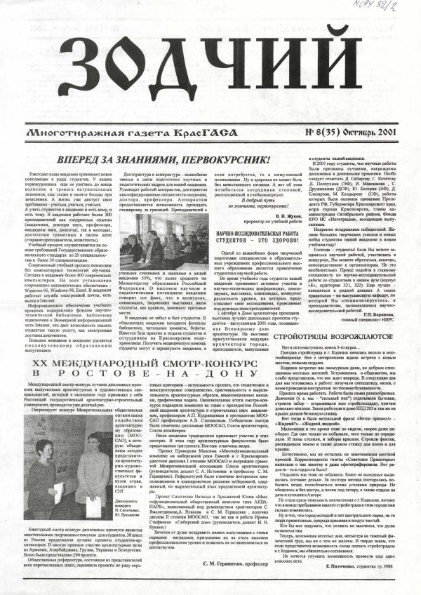 Зодчий : газета/ Красноярская государственная архитектурно-строительная академия. - Красноярск : КрасГАСА 2001г. N 8 (35) (октябрь) Полный текст ( 3.9 Мб; PDF). Ресурс свободного доступа