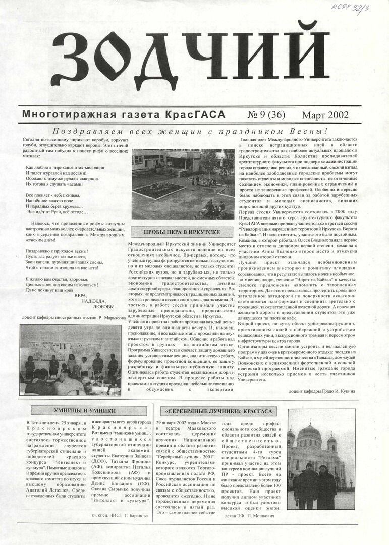 Зодчий : газета/ Красноярская государственная архитектурно-строительная академия. - Красноярск : КрасГАСА 2002г. N 9 (36) (март) Полный текст ( 3.3 Мб; PDF). Ресурс свободного доступа