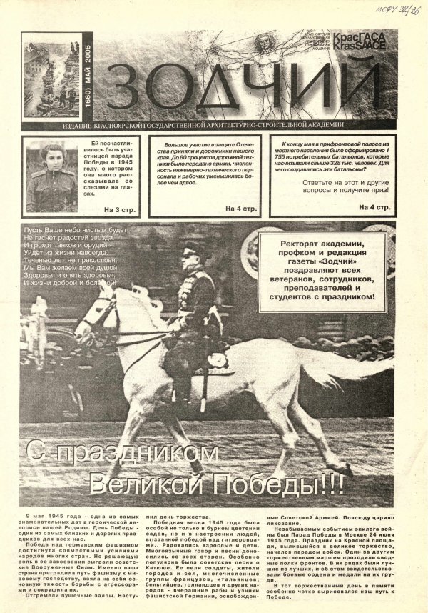 Зодчий : газета/ Красноярская государственная архитектурно-строительная академия. - Красноярск : КрасГАСА 2005г. N 16 (60) (май) Полный текст ( 8.3 Мб; PDF). Ресурс свободного доступа