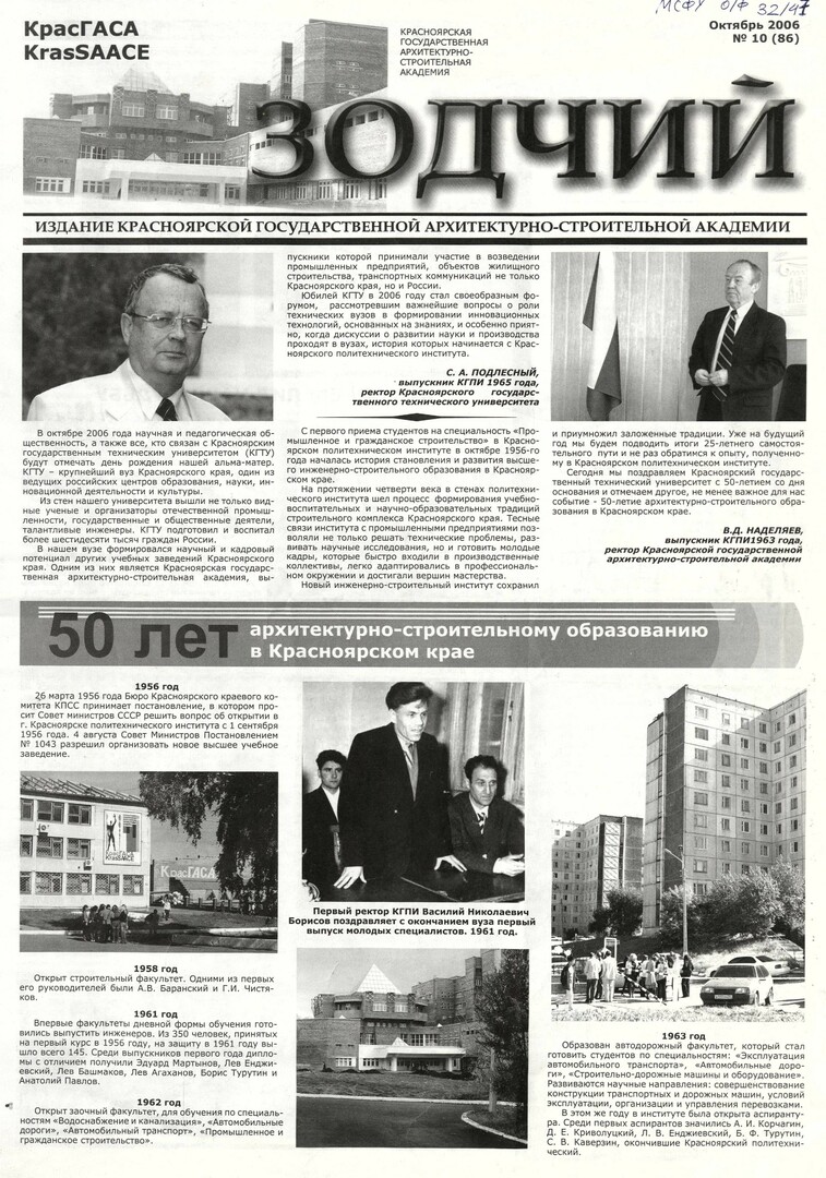 Зодчий : газета/ Красноярская государственная архитектурно-строительная академия. - Красноярск : КрасГАСА 2006г. N 10 (86) (октябрь) Полный текст ( 10.1 Мб; PDF). Ресурс свободного доступа