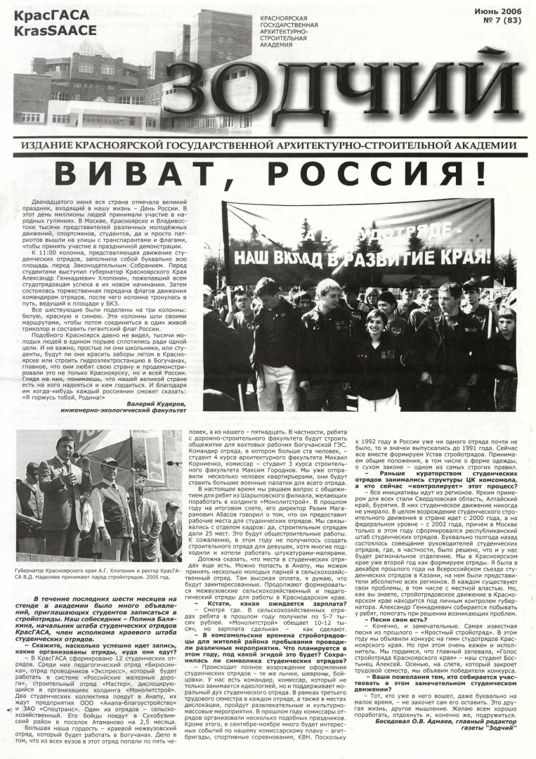 Зодчий : газета/ Красноярская государственная архитектурно-строительная академия. - Красноярск : КрасГАСА 2006г. N 7 (83) (июнь) Полный текст ( 9.8 Мб; PDF). Ресурс свободного доступа