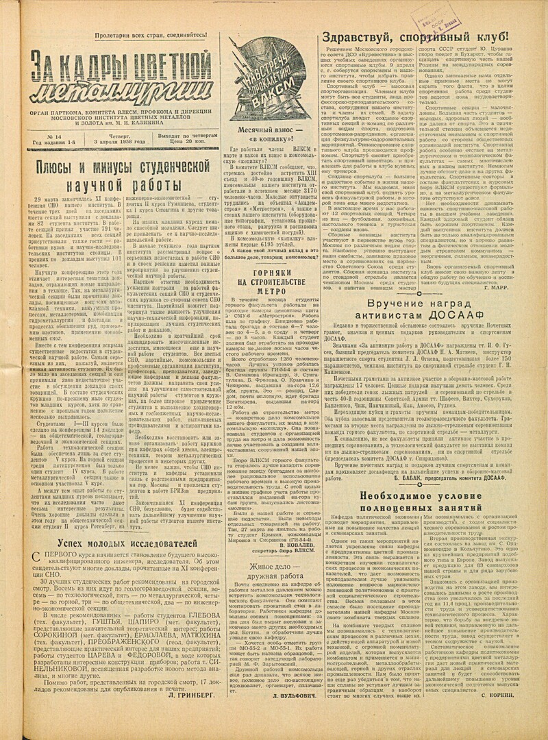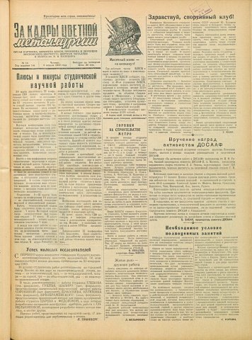 За кадры цветной металлургии : газета. 1958 г. № 14 (3 апреля)выпуск журнала/газеты