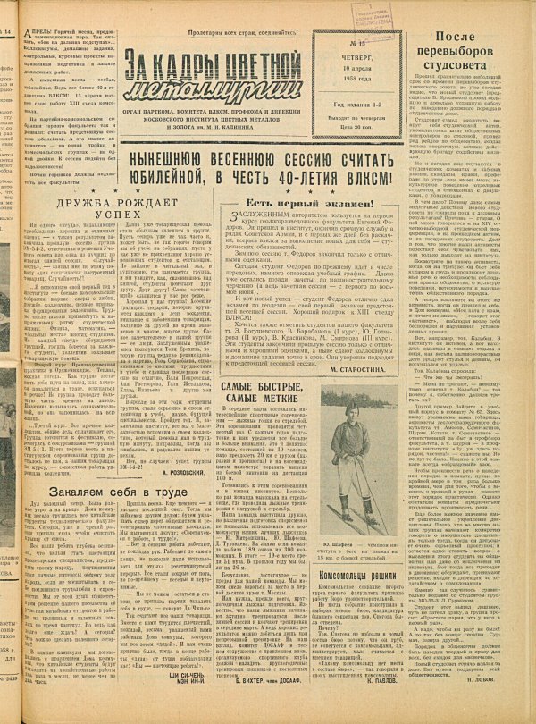За кадры цветной металлургии : газета. 1958 г. № 15 (10 апреля)выпуск журнала/газеты