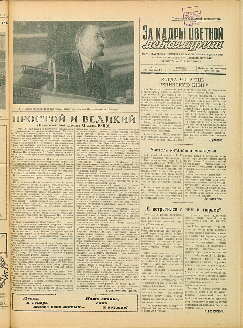 За кадры цветной металлургии : газета. 1958 г. № 16 (18 апреля)выпуск журнала/газеты