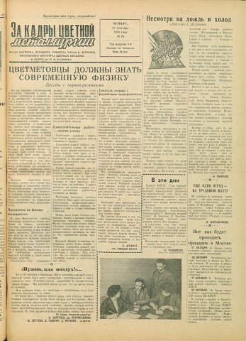 За кадры цветной металлургии : газета. 1958 г. № 29 (25 сентября)выпуск журнала/газеты
