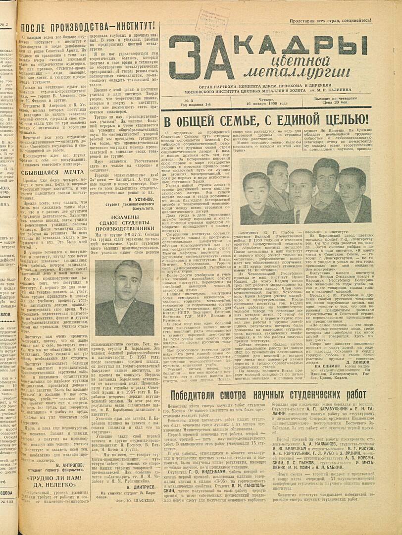 За кадры цветной металлургии : газета. 1958 г. № 3 (16 января)выпуск журнала/газеты