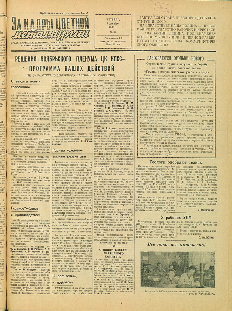 За кадры цветной металлургии : газета. 1958 г. № 39 (4 декабря)выпуск журнала/газеты