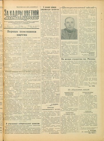 За кадры цветной металлургии : газета. 1958 г. № 5 (30 января)выпуск журнала/газеты