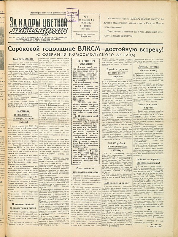 За кадры цветной металлургии : газета. 1958 г. № 9 (27 февраля)выпуск журнала/газеты