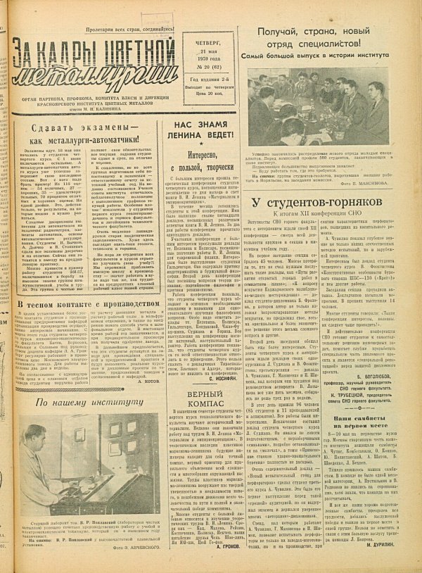 За кадры цветной металлургии : газета. 1959 г. № 20 (62) (21 мая)выпуск журнала/газеты