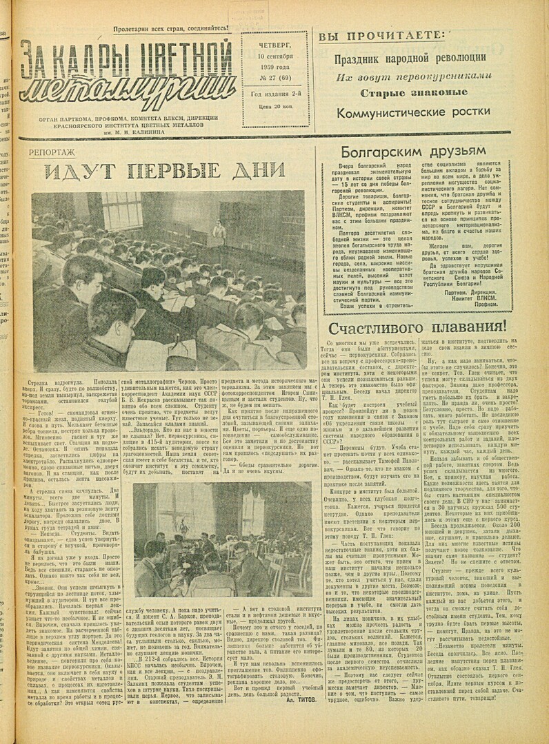 За кадры цветной металлургии : газета. 1959 г. № 27 (69) (10 сентября)выпуск журнала/газеты