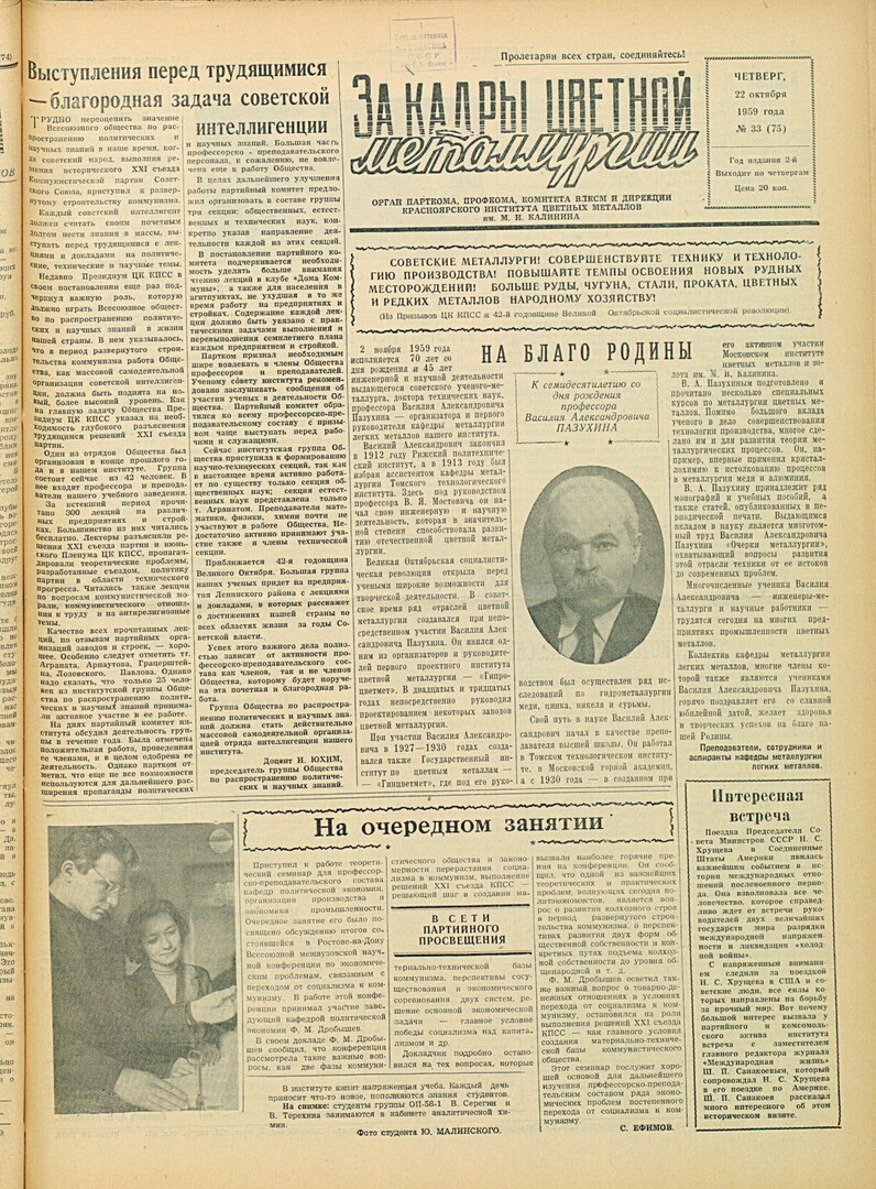 За кадры цветной металлургии : газета. 1959 г. № 33 (75) (22 октября)выпуск журнала/газеты