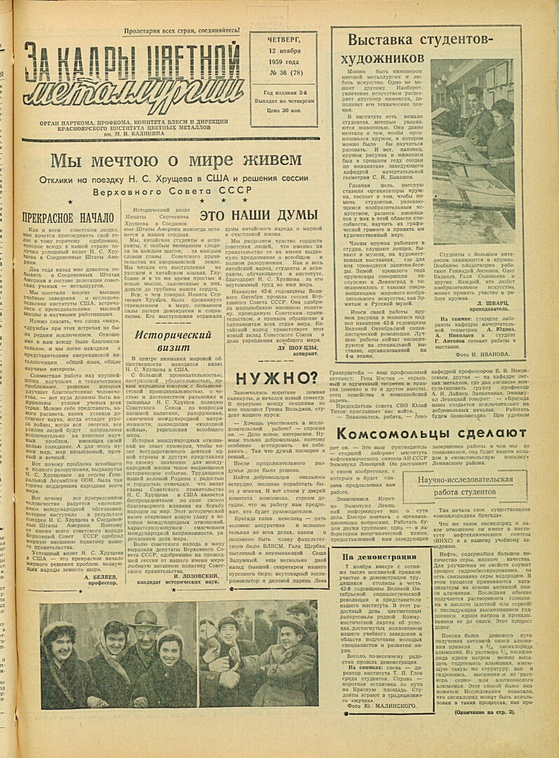 - Мы мечтою о мире живем. Прекрасное начало. Исторический визит. Это наши думы : Отклики на поездку Н. С. Хрущева в США и решения сессии Верховного Совета СССР. — С. 1.