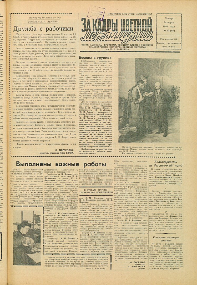 За кадры цветной металлургии : газета. 1960 г. № 10 (95) (24 марта)выпуск журнала/газеты