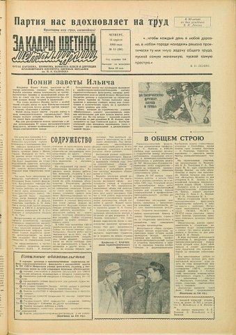 За кадры цветной металлургии : газета. 1960 г. № 13 (98) (14 апреля)выпуск журнала/газеты