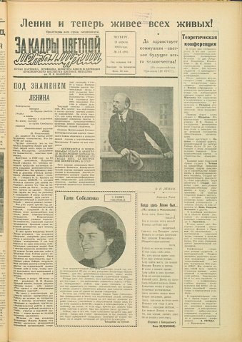 За кадры цветной металлургии : газета. 1960 г. № 14 (99) (21 апреля)выпуск журнала/газеты