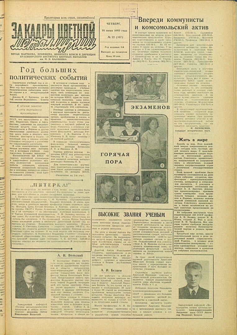 - Высокие звания ученым : [член Академии наук СССР А. Н. Вольский : член-корреспондент Академии наук СССР А. И. Беляев : на фото к заметке: А. Н. Вольский, А. И. Беляев]. — С. 1.