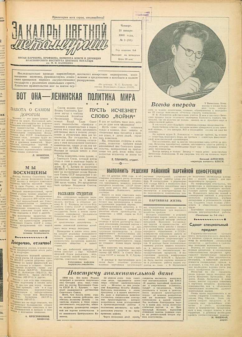 За кадры цветной металлургии : газета. 1960 г. № 3 (88) (21 января)выпуск журнала/газеты