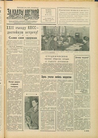 - Студенческое научное общество. Поиски нового : [студенческий научно-технический кружок на кафедре металлургии тяжелых металлов]. — С. 2.