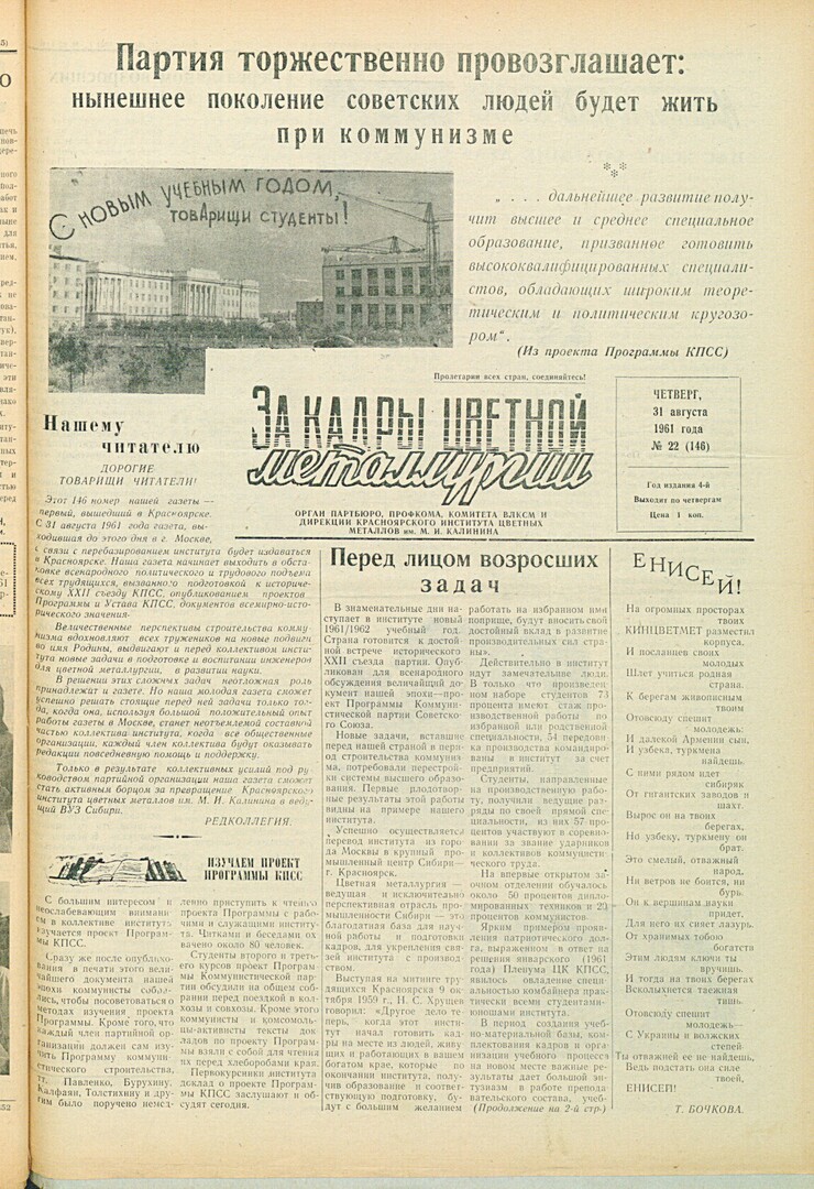 - Нашему читателю : [первый номер газеты, вышедший в Красноярске]. — С. 1.