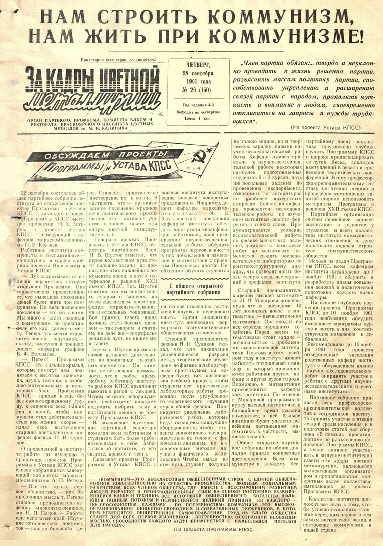 - Обсуждаем проекты Программы и Устава КПСС : с общего открытого партийного собрания. — С. 1.