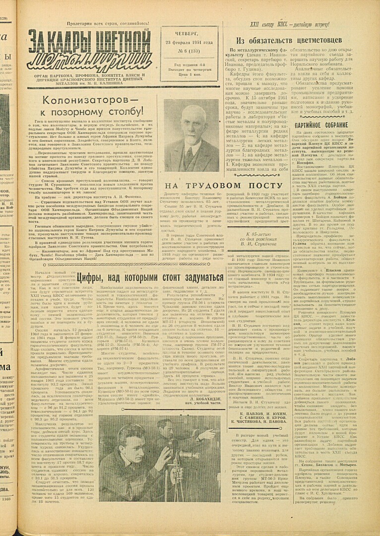 За кадры цветной металлургии : газета. 1961 г. № 6 (130) (23 февраля)выпуск журнала/газеты